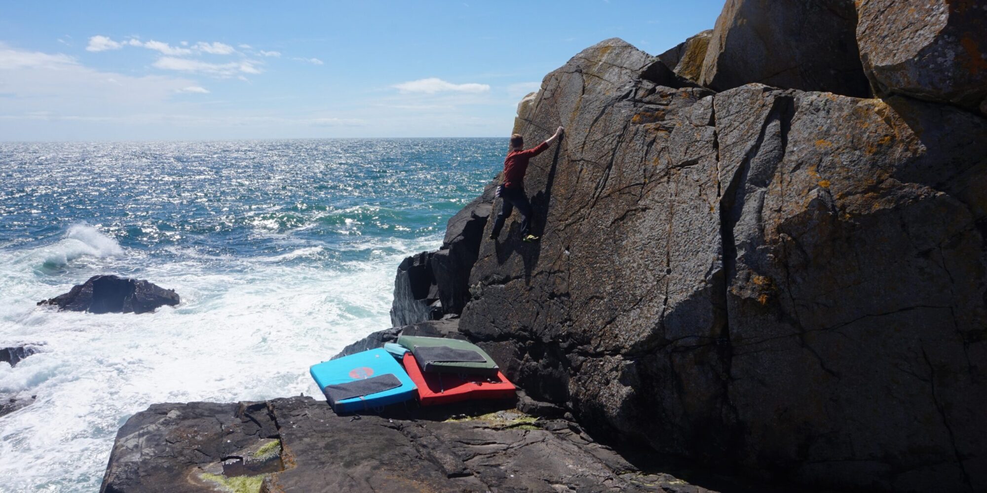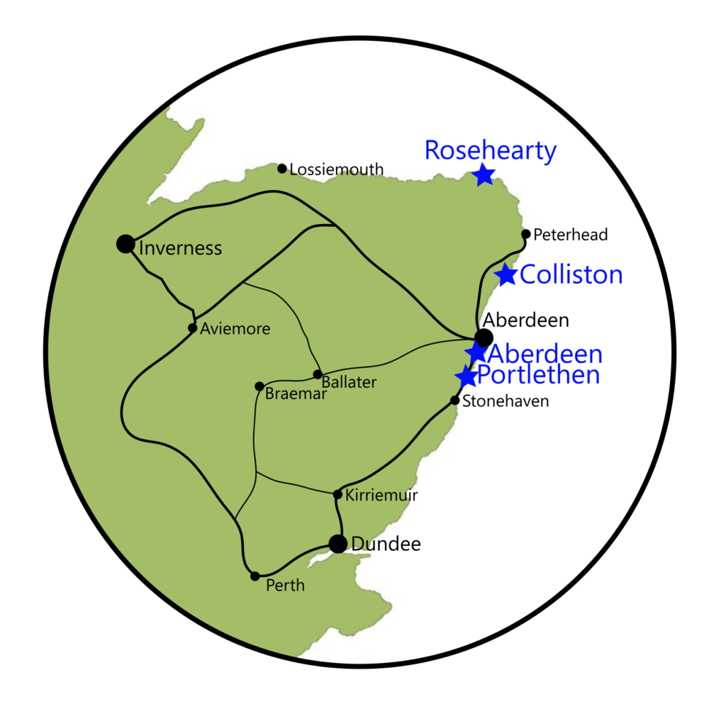 Our base is in Aberdeen where the closest bouldering is on sea cliffs just 10 minutes drive from the city centre – near Cove. There is also good bouldering near Portlethen and Newtontill. Further afield there is good bouldering too at “Kattys leap” at Rosehearty, near Fraserburgh.